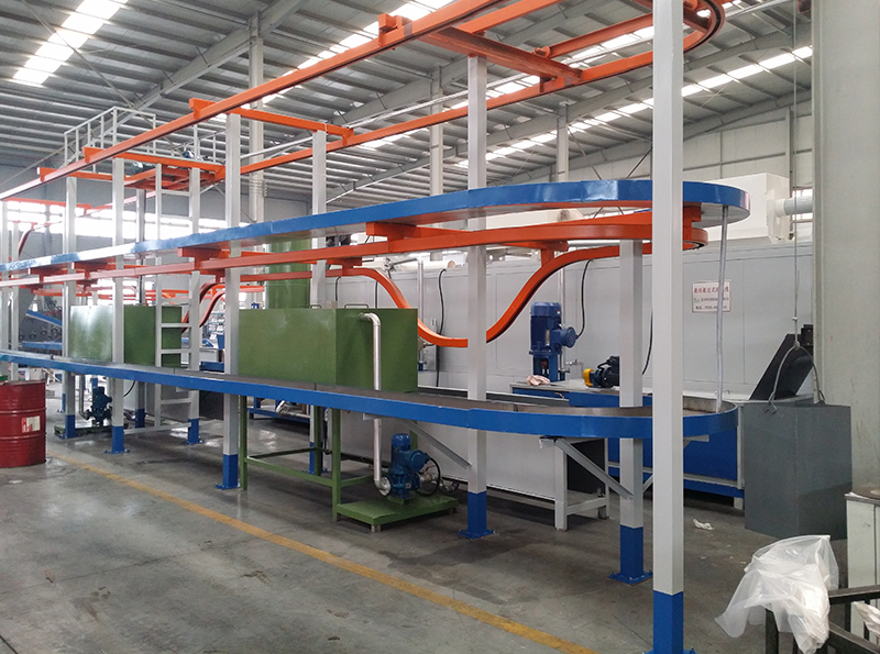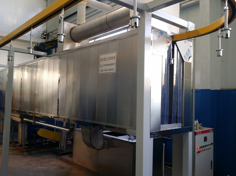 采用噴淋清洗配合液下射流清晰地新型工藝,由于清洗在液下完成,減少煤油在空氣中的霧化,既節省了生產成本,又提高了產品質量。配合懸掛式輸送機經浸防銹油、瀝油、吹干等工藝完成清洗過程。